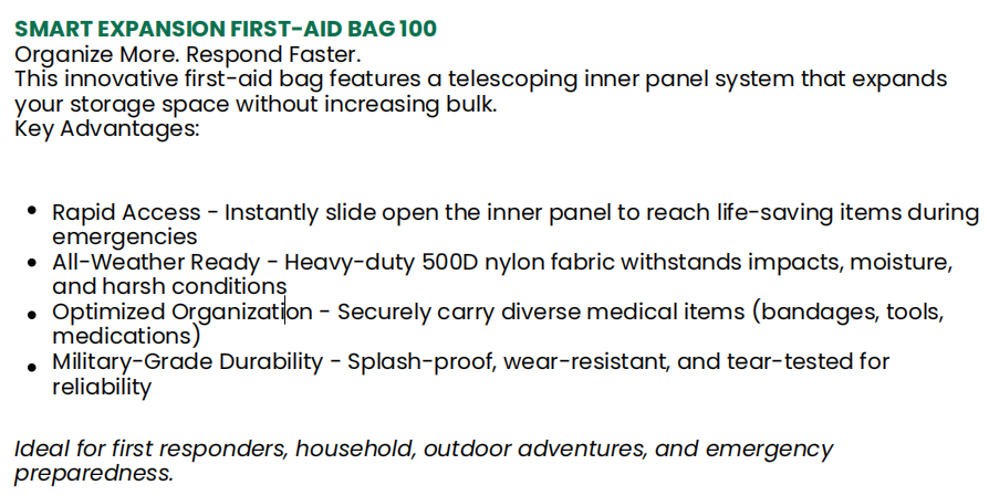 Your Location:Home >Products >Emergency Medical Supplies >EQUIPMENT BAGS & KITS >FIRST AID BAG & KIT >SMART EXPANSION FIRST-AID BAG 100